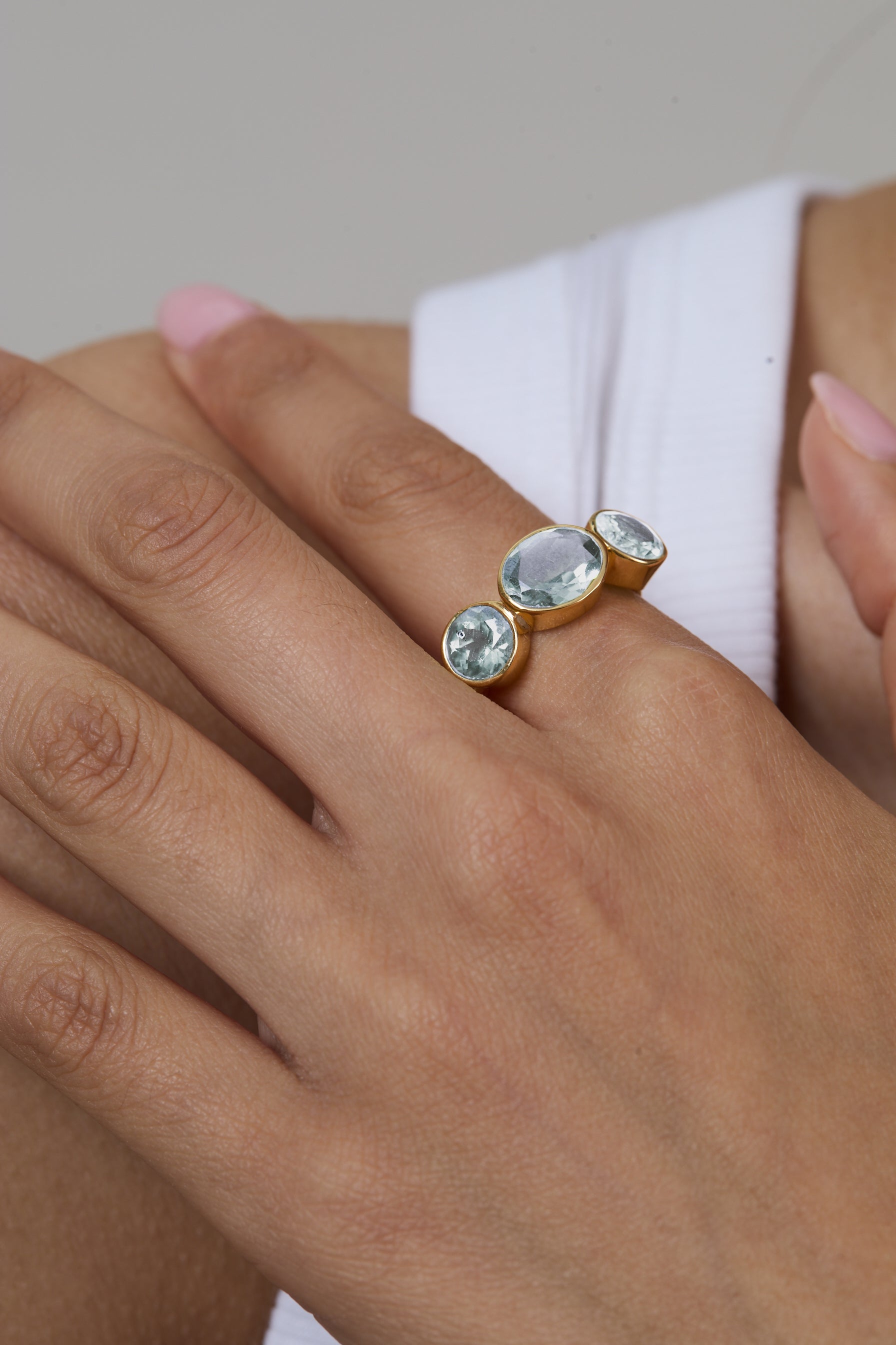 A luminous design featuring three sky-blue topaz gemstones set in radiant gold. Refreshing and elegant, this ring captures the calm brilliance of clear waters and endless skies.